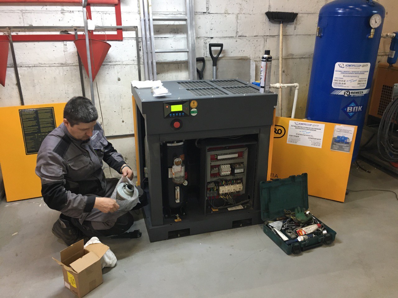 Первый запуск компрессора лучше всего доверить профессионалу, который постоянно проходит обучение у изготовителя и знает много тонкостей в работе с этим оборудованием. Он проведет необходимые проверки, запустит компрессор, проверит его работу на всех режимах, сделает настройки контроллера под ваш режим работы, проведет инструктаж по работе с компрессором и заполнит акт первого запуска, который будет необходим в случае гарантийного обращения.